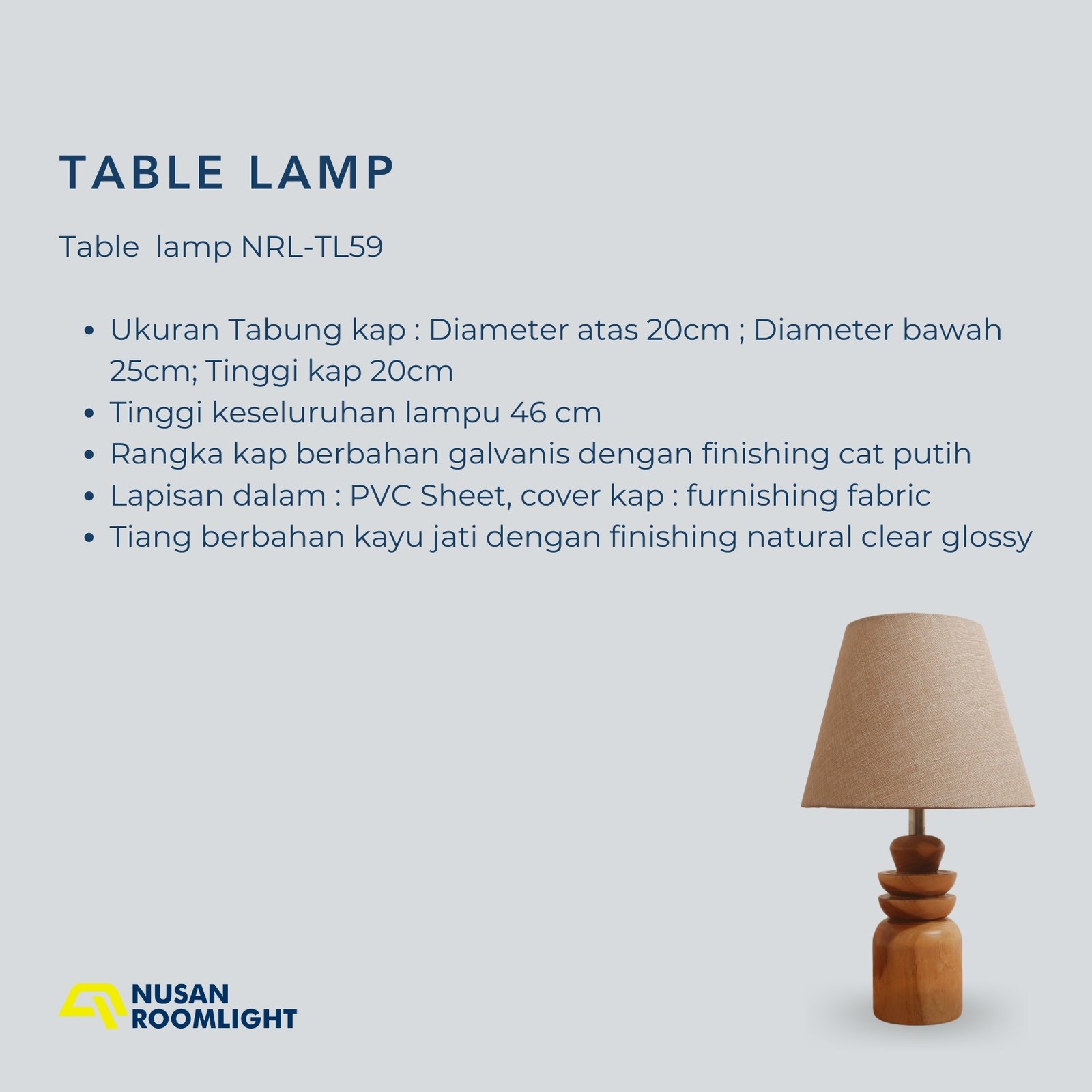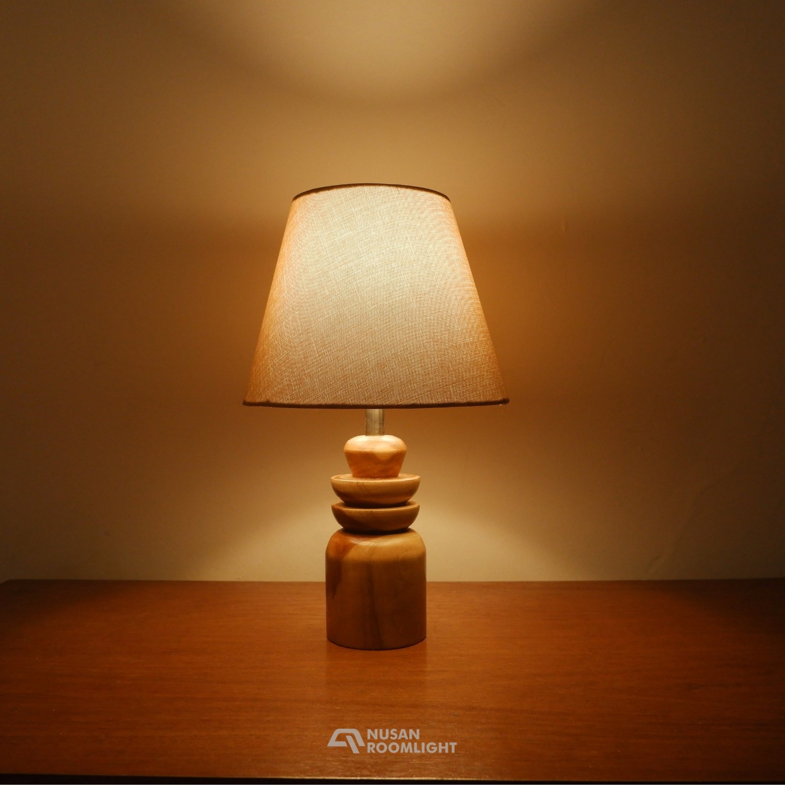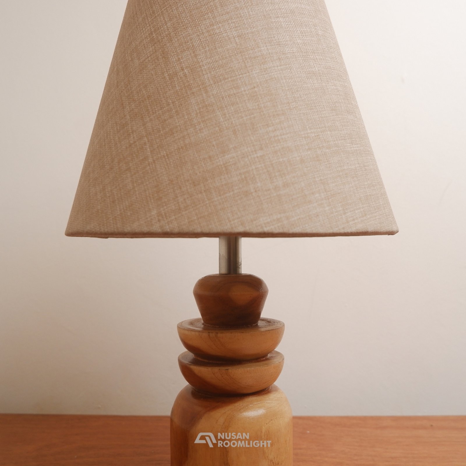Nusan Roomlight NRL-TL59 adalah lebih dari sekadar lampu meja; ini adalah sebuah objek seni yang dirancang untuk memperkaya estetika ruang Anda. Setiap basis lampu diukir dari bongkahan kayu jati solid, menampilkan bentuk organik bertingkat yang terinspirasi dari keindahan alam dan seni kriya tradisional. Kehadirannya di atas meja nakas atau meja konsol akan menambahkan sentuhan kemewahan yang bersahaja dan otentik.