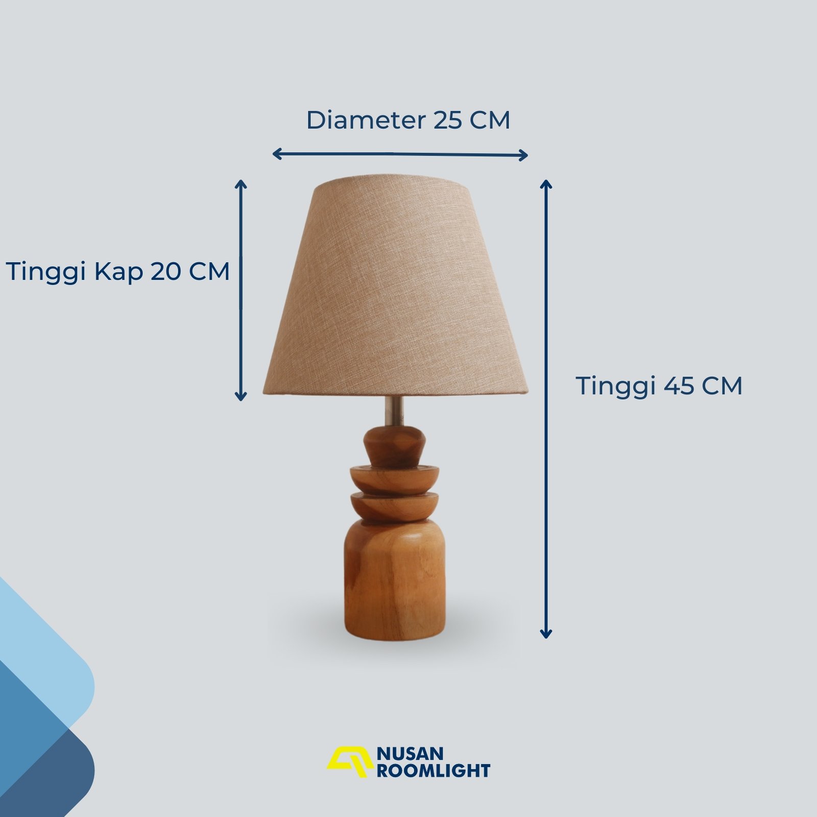 - Dimensi Kap Lampu: Diameter Bawah 25 cm, Diameter Atas 20 cm, Tinggi 20 cm