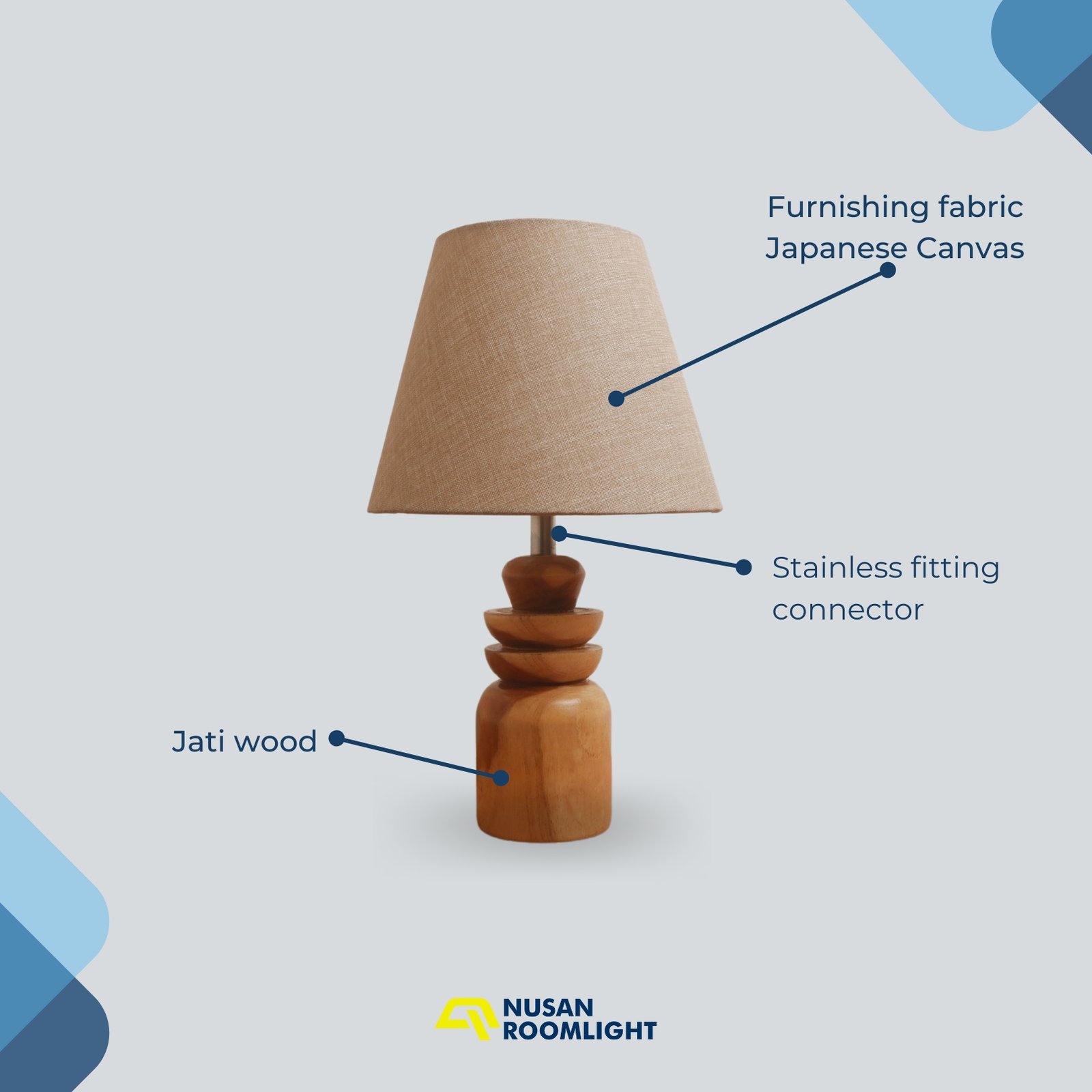 - Material: Dudukan Kayu Jati Solid, Konektor Stainless Steel, Kap Kain Japanese Canvas
